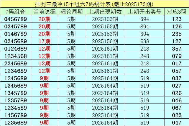 (1)在摆设三已开出的7297期奖号中(统计兑现第2025173期),现在7码组六遗漏值最大的组合为:0456789、0345789、0146789,本期遗漏20期;