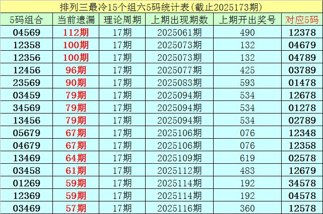 (5)摆设三现在遗漏值最大的5码组六组合为:04569,本期遗漏112期,短期解冻的可能性较小,则25174期奖号分辩在04569-12378之中的可能性最大。
