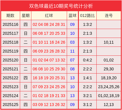 开奖挂牵:双色球2025125开奖号码为03、09、12、13、26、32+09。其中012路比为3:1:2、开出1组连号12,13。