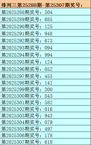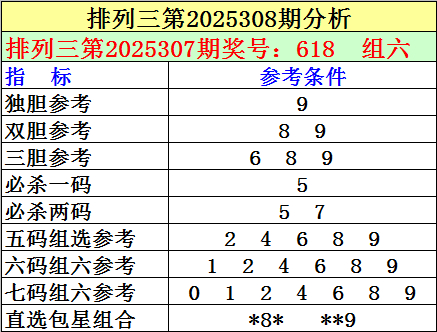 1.胪列三最近十期分袂开出号码:141-300-843-582-016-943-079-497-178-618,其中有7期奖号开出了上期的访佛号码,本期预测第2025307期奖号:618中有重号,参考号码:8。 2.现在胪列三组六遗漏最大的六码组合为:023689,遗漏25期。本期防该组合解冻,即摈斥剩余四个号码,存眷号码:6。 3.面前胪列三组六遗漏最大的七码组合为:1235679,遗漏15期,本期不看好解冻,预测剩余三码中有出号,存眷号码:8。 4.本期独胆参考:9。