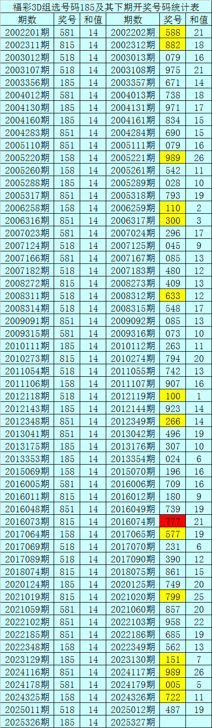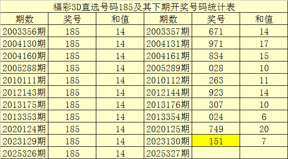 二、组选分析:历史上组选号码185开出了56次,其下期奖号分袂为:588-882-079-975-671-738-971-834-690-079-989-542-028-793-110-300-296-045-085-480-409-633-548-085-073-263-794-742-907-100-923-266-496-307-024-196-709-180-739-777-577-231-390-861-749-799-857-958-685-562-151-989-005-722-487,其开出期数和下期奖号统计为:
